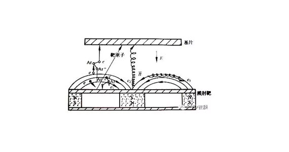 磁控溅射又称为高速低温溅射。在磁场约束及增强下的等离子体中的工作气体离子 (如 Ar+),在靶阴电场的加速下,轰击阴材料,使材料表面的原子或分子飞离靶面,穿越等离子体区以后在基片表面淀积、迁移终形成薄膜。